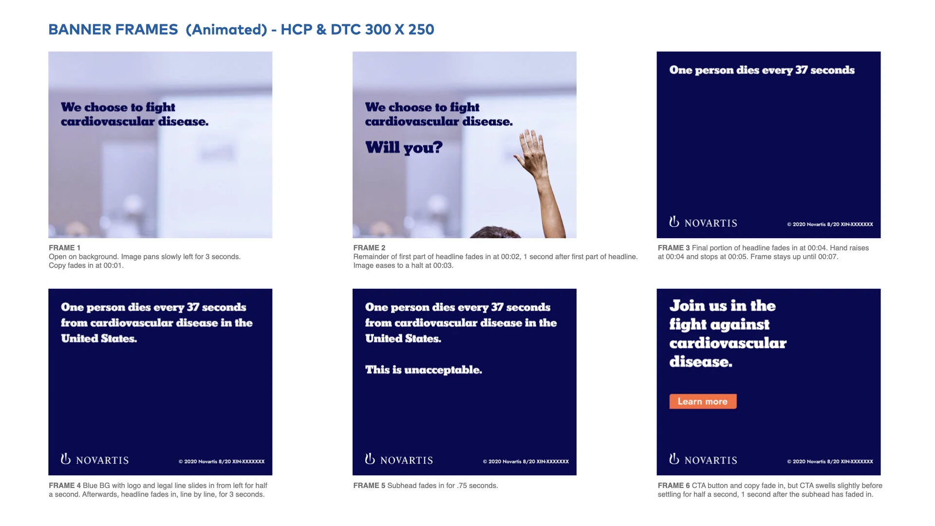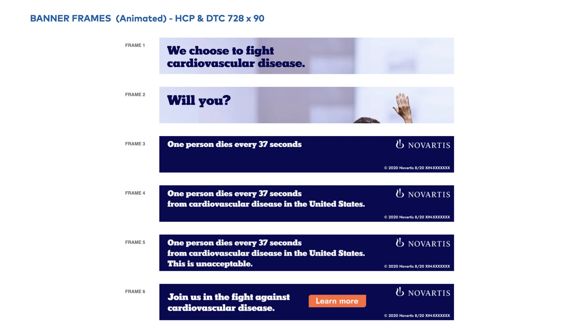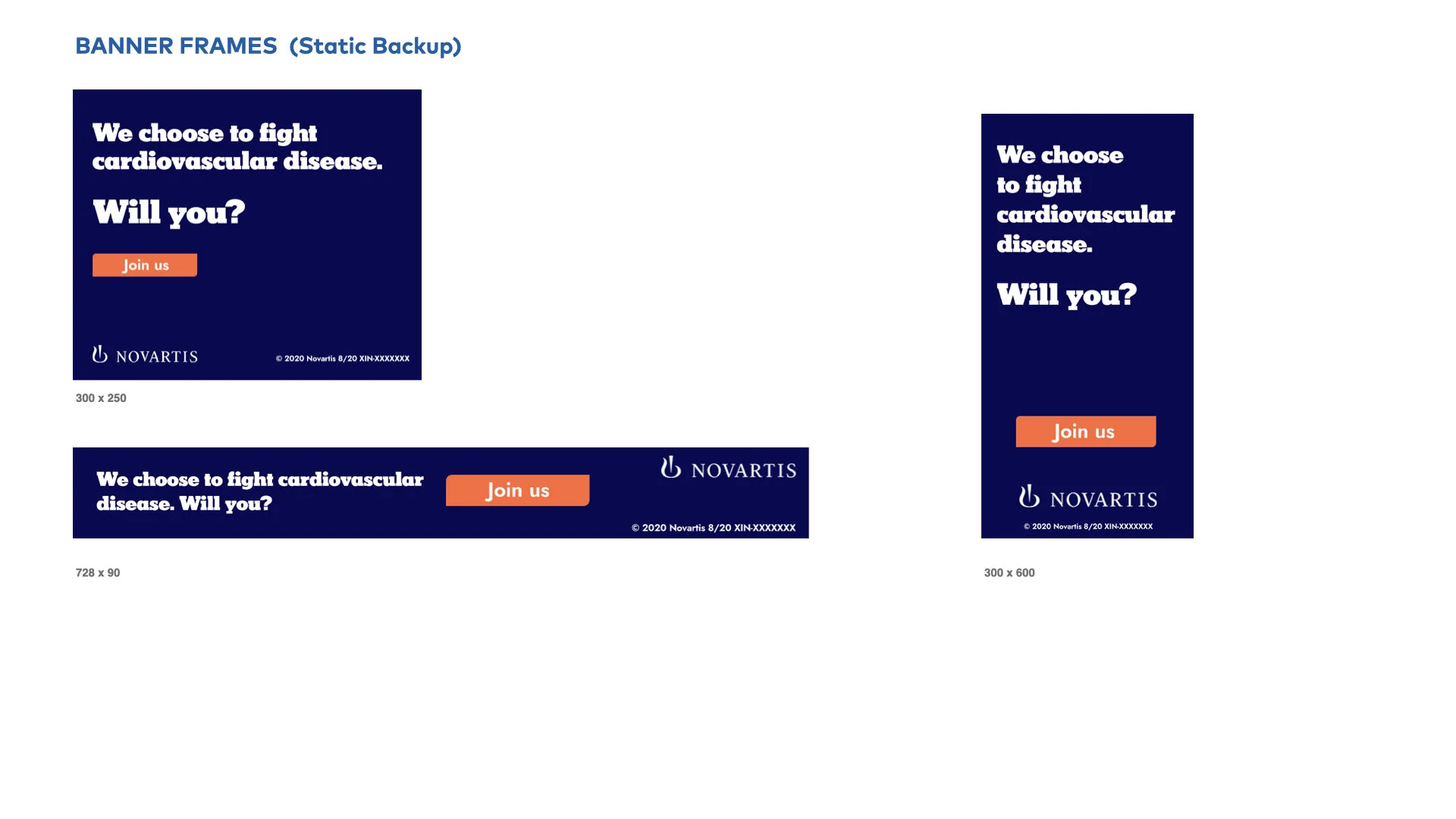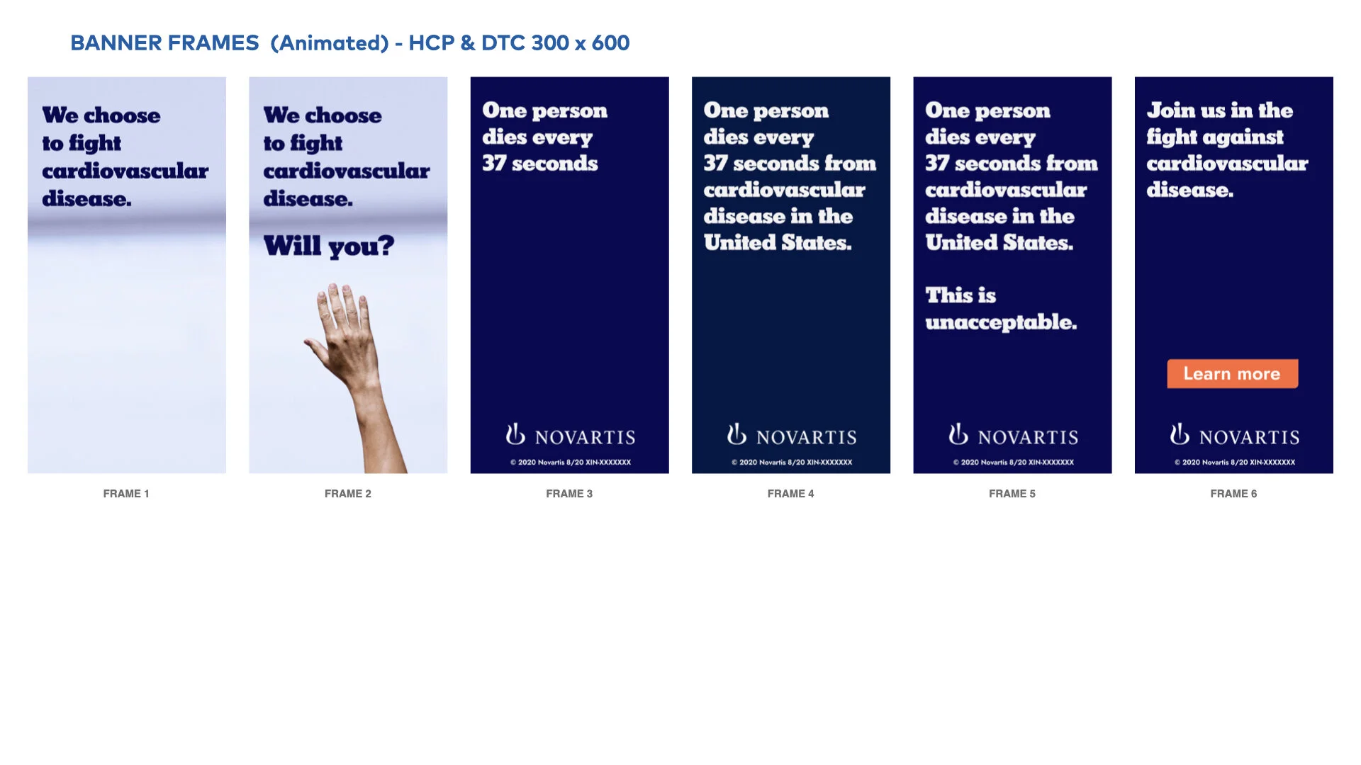 Following brand guidelines established by the Senior Art Director, I designed each of the main key frames of the storyboard in the 300 by 250 format first, for an animated banner as well as a static frame. Once those were approved, I worked on additional aspect ratios and their matching static frames.